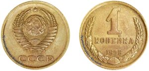 1 копейка 1958 года, невыпущенная в обращение монета. Медно-цинковый сплав, 0,96г. Сохранность очень хорошая. Очень редкая.