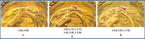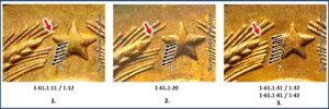1961 год. Штемпель. 1-61.1-20 Герб приспущен. Фото 1.— К звезде снизу подходит 6 остей. Зерно слева от луча звезды без ости. Фото 2.— Вариант координатной сетки. Фото 3.—Отросток у четвертого внутреннего зерна. Цена: 0,5-1 $