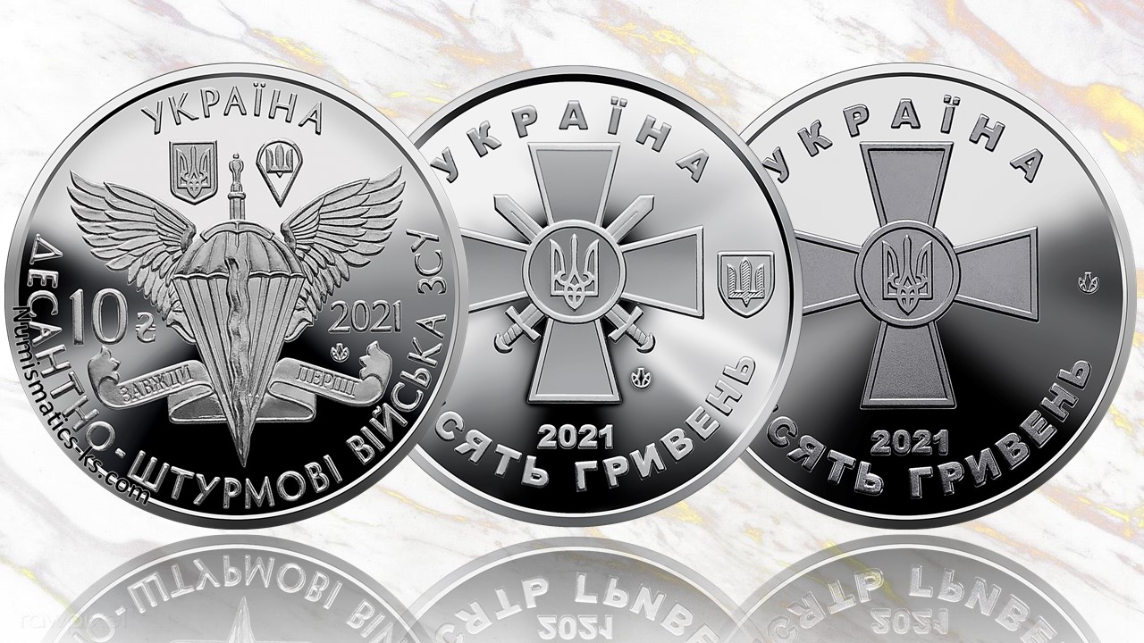«Десантно-штурмовые войска Вооружённых Сил Украины» — монета посвящена мобильному и высокоэффективному роду войск, входящему в силы немедленного реагирования. Десантно-штурмовые войска характеризуются высокой маневренностью и автономностью действий. Их задачи включают быстрое развертывание, проведение наступательных и штурмовых операций, прикрытие стратегических направлений, а также ведение боевых действий в тылу противника.