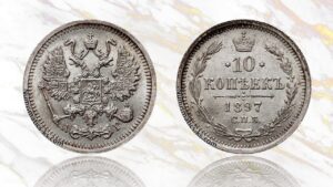 10 копеек 1897 года – одна из наиболее интересных серебряных монет периода правления Николая II. Она была отчеканена на Санкт-Петербургском монетном дворе тиражом около 4 миллионов экземпляров. На аверсе монеты указаны инициалы минцмейстера «АГ» – Аполлона Грасгофа, что является важной деталью для коллекционеров.
