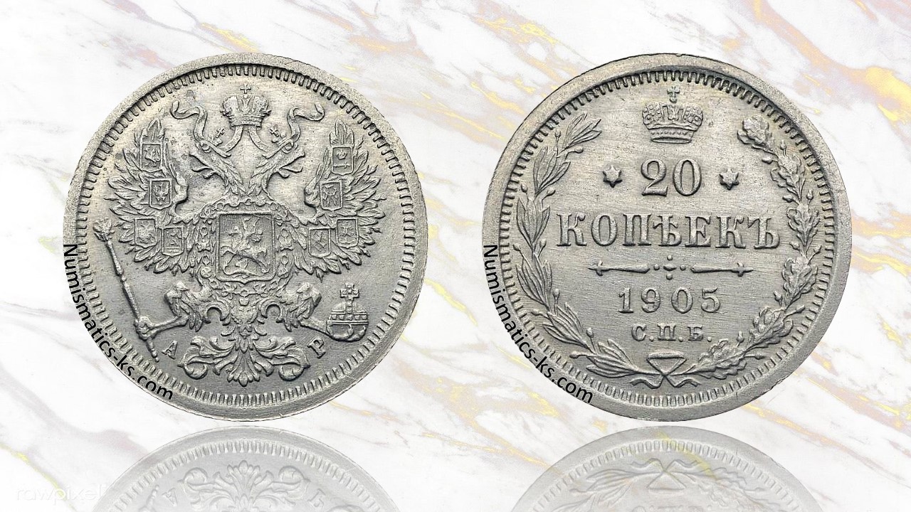 Монета 20 копеек 1905 года — одна из популярных серебряных монет периода правления императора Николая II. Она чеканилась на Санкт-Петербургском монетном дворе из серебра 500-й пробы и входит в состав нумизматической серии монет Российской Империи начала XX века.