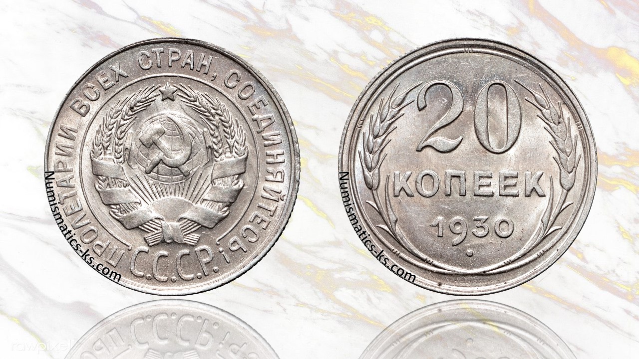 Монета номиналом 20 копеек 1930 года чеканилась из серебра 500 пробы (билон) и относится к последним серебряным монетам Советского Союза. Тираж составил 31,2 миллиона экземпляров. Несмотря на большое количество, хорошо сохранившиеся экземпляры сегодня ценятся коллекционерами. Монета интересна как своей исторической эпохой, так и составом — настоящая частичка серебряной нумизматики СССР.