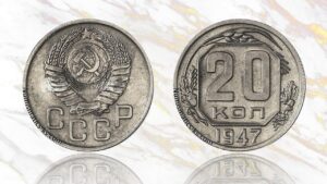Монета 20 копеек 1947 года — одна из редчайших пробных монет СССР, представляющая особую ценность для коллекционеров. Она изготовлена из мельхиора и имеет уникальный дизайн аверса: герб СССР с 16 витками ленты вокруг колосьев. Разновидностей эта монета не имеет.