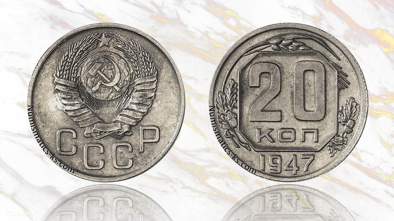 20 копеек 1947 года — пробная монета. Редкая монета из мельхиора, выпущенная в 1947 году в пробном варианте. Отличительная особенность — новый тип аверса с гербом СССР, содержащим 16 витков ленты. Такие экземпляры не поступали в массовое обращение и представляют значительную нумизматическую ценность.