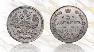 5 копеек 1911 года – серебряная монета Российской империи, отчеканенная на Санкт-Петербургском монетном дворе в период правления императора Николая II. На аверсе монеты указаны инициалы минцмейстера «ЭБ» – Эликума Бабаянца, руководившего чеканкой. Общий тираж составил около 2,7 млн экземпляров, что делает монету достаточно распространённой, но её стоимость напрямую зависит от состояния и редкости варианта чеканки.